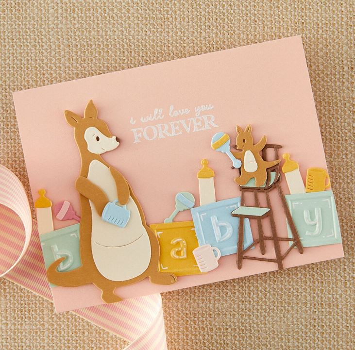 Sätt ihop denna söta Kanga och hennes lilla Roo med detta set med sju tunna metallstansar. Dokumentera en bebis söta början med denna barnklassiker som finns hos Spellbinders! Detta speciella samarbete med Simple Stories väcker en underbar grupp barndomsvänner till liv!