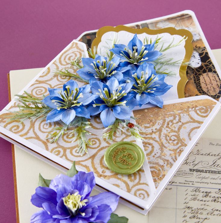 När dessa dies monteras skapar detta set med fem tunna metallstansar en blomma med ett delikat och dimmigt spetsbladverk som omger den. Gör en enda blomma eller skär flera till en bukett. Den färdiga blomman med bladverk mäter 0,50 x 1,75 x 2,75 tum/1,30 x 4,50 x 7,00 cm.